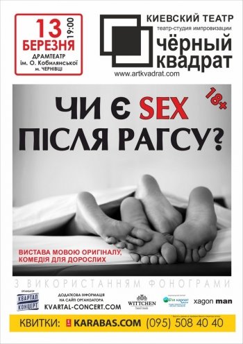 Анонси 13-го березня у Чернівцях за адресою: пл. Театральна, 1, в Облмуздрамтеатрі ім. О. Кобилянської, о 19:00 розпочнеться вистава київського театрну Чорний квадрат "Чи є SEX після РАЦСу?". Вистава для дорослих. "Жорсткі та відверті жарти не призначені для людей, що віддають перевагу банальності в сексі. Комедія дуже яскрава і соковита – бо про нас, тому що про любов і секс. А це дуже рідко буває сумним чи нудним. Також небажані глядачі з святенницькими поглядами на світ, і особливо без почуття гумору. А любителі чорного гумору отримають кайф подвійно! Ну, і наостанок. Шлях до радості у кожного свій. Але якщо театр допомагає позбутися від брехні, вчить довірі і дає віру в любов — хай живуть вистави про Це", - анонсують організатори.