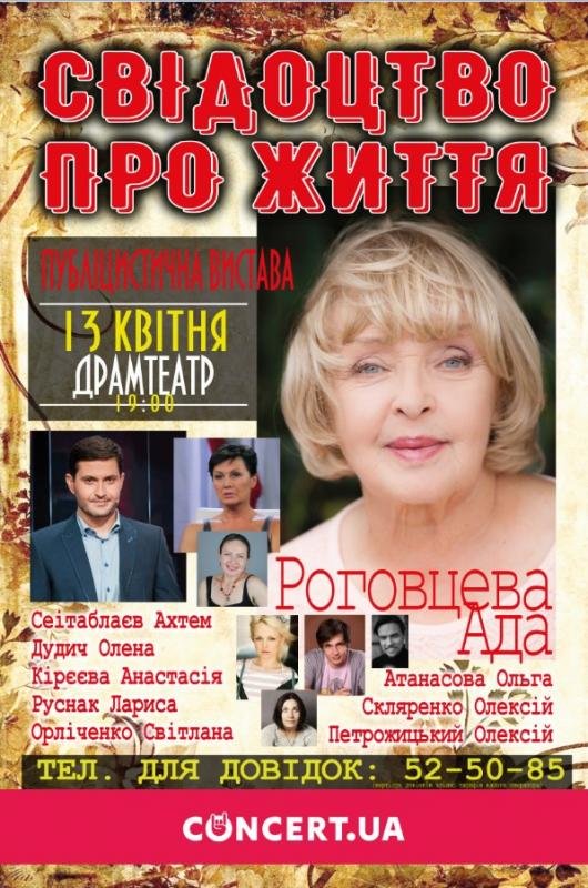 «Свідоцтво про життя» - унікальна театральна постановка за мотивами книги незрівнянної акторки Ади Роговцевої. А оскільки в книзі відображені реальні події минулого, ця вистава за жанром швидше публіцистична, ніж художня.