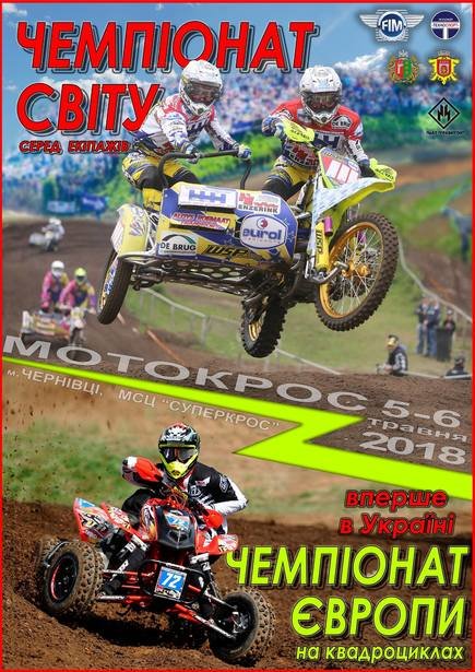 5-го та 6-го травня у Чернівцях за адресою:МСЦ "Суперкрос" триватиме чемпіонат світу та Європи з мотокросу та вперше в Україні — чемпіонат Європи на квадроциклах. У Чемпіонаті Світу візьмуть участь спортсмени з Австрії, Великої Британії, Голландії, Швейцарії, Швеції, Німеччини, Бельгії, Франції, Естонії, Люксембургу, Данії, Фінляндії, Литви, Латвії, Чехії, України. "Траса мотокросу, віражі, трампліни, тридцять екіпажів та шістдесят мотогонщиків, які завмерли на старті, збираючись силою та духом та з надією на перемогу. Мотокрос – це не просто ЕКСТРИМ, це СУПЕРЕКСТРИМ, це вибух адреналіну, що не залишає жодної людини байдужою до побаченого", — анонсують організатори.