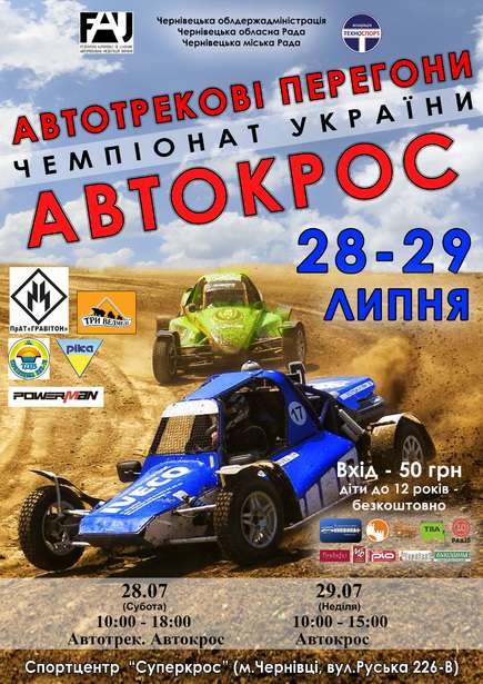28-го та 29-го липня у Чернівцях, до Дня Конституції, відбудуться 2 Чемпіонати України з автомобільного спорту на території МСЦ "Суперкрос" за адресою: вул. Руська, 226(В). Зокрема, 28-го липня триватиме Чемпіонат України з Автотрекових перегонів (Автоспідвей) на спортивних легкових автомобілях А 29-го липня відбудеться Чемпіонат України з Автокросу: на спортивних легкових автомобілях; спортивно-кросових автомобілях «багі»; спортивно-кросових автомобілях «міні-багі» 1Ю-молодша група (діти віком від 5 до 10 років) та 1Ю-старша група (діти віком від 10 до 16 років). Програма Чемпіонату України з Автокросу: – 28 липня: з 08:00 до 12:00 – адміністративна та технічна перевірка; з 12:00 до 18:00 – вільні тренування, кваліфікаційні заїзди, які будуть вирішувати місця на старті спортсменів та перша серія фінальних заїздів; – 29 липня: з 10:00 до 15:00 фінальні серії заїздів у всіх класах автомобілів та нагородження переможців змагань.