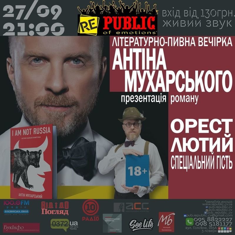 Антін Мухарський запрошує на літературно-пивну вечірку-концерт у Чернівцях, присвячену презентації його чоловічого роману I AM NOT RUSSIA. Спеціальним гостем заходу буде Орест Лютий з його лагідною, суворою і дуже суворою українізацією. :)