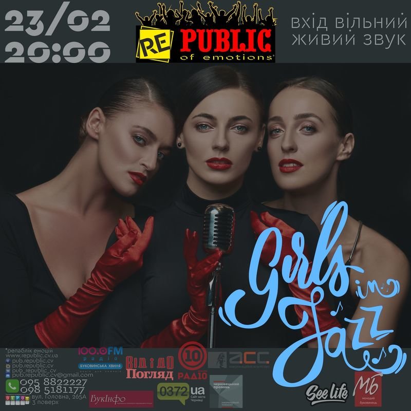 Вони стильні і незвичайні ... Три чарівних голоси гармонійно поєднуються з їх яскравою зовнішністю та харизмою. Звабливий соул, драйвовий фанк і вибуховий рок-н-рол. Ваші улюблені хіти у новому музичному соусі. Їх неодмінно треба чути і бачити. Зустрічайте, girl cover band «Girls in Jazz».