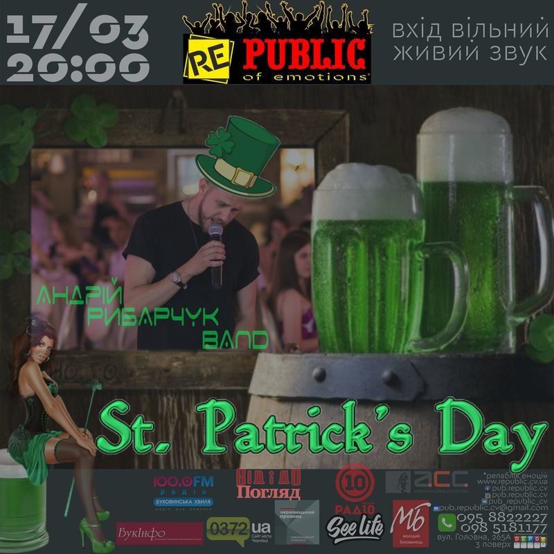 Плануємо Ірландську вечірку під келих хмільного та під музику відомого Андрія Рибарчука. Море віски, зеленого пива та гарного настрою в пабі RePublic!
