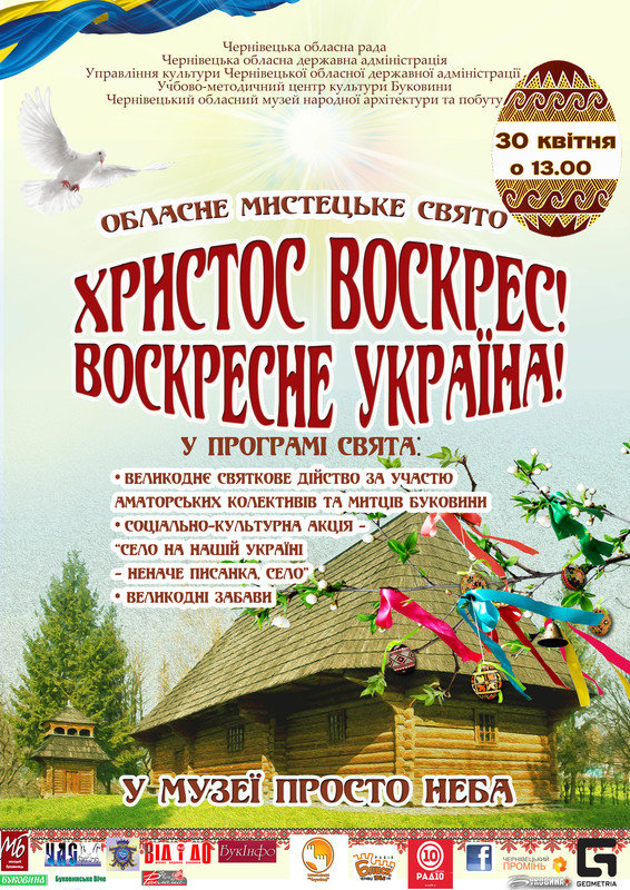 30 квітня 2019 року у Чернівецькому обласному музеї народної архітектури та побуту відбудеться мистецьке свято «Христос Воскрес! Воскресне Україна!»