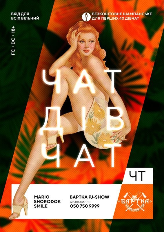 Життя набуває нових барв щочетверга на серії вечірок "Чат дівЧат" з вродою та посмішками, що сяють і танцюють, насолоджуючись хітами та шампанським у wellcome drink в нічному клубі "Бартка"!