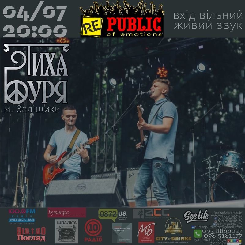 Літо надихає на сонячні дні та яскраві емоції, але і без дощів та бурі нам не цікаво. Запрошуємо послухати нові обличчя в RePublic. Знайомтесь з колективом з міста Заліщики гурт "Тиха Буря". Тиха Буря -музика драйву та любові.