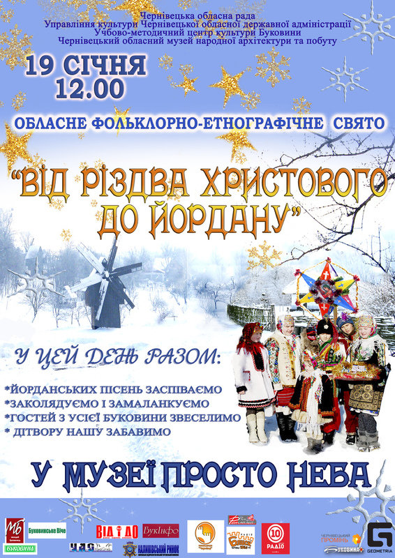 Організатори заходу – Чернівецька обласна рада, управління культури Чернівецької обласної державної адміністрації, учбово-методичний центр культури Буковини, Чернівецький обласний музей народної архітектури і побуту ласкаво запрошують чернівчан та гостей міста на обласне фольклорно-етнографічне свято «Від Різдва Христового до Йордану»!