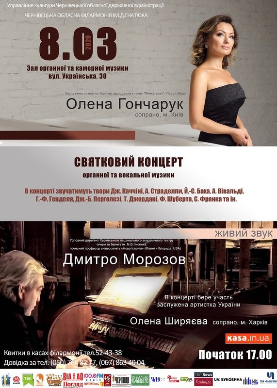 Квитки в касі філармонії, тел. (0372) 52 43 38; в касі органного залу – в день концерту за 30 хв. до початку
