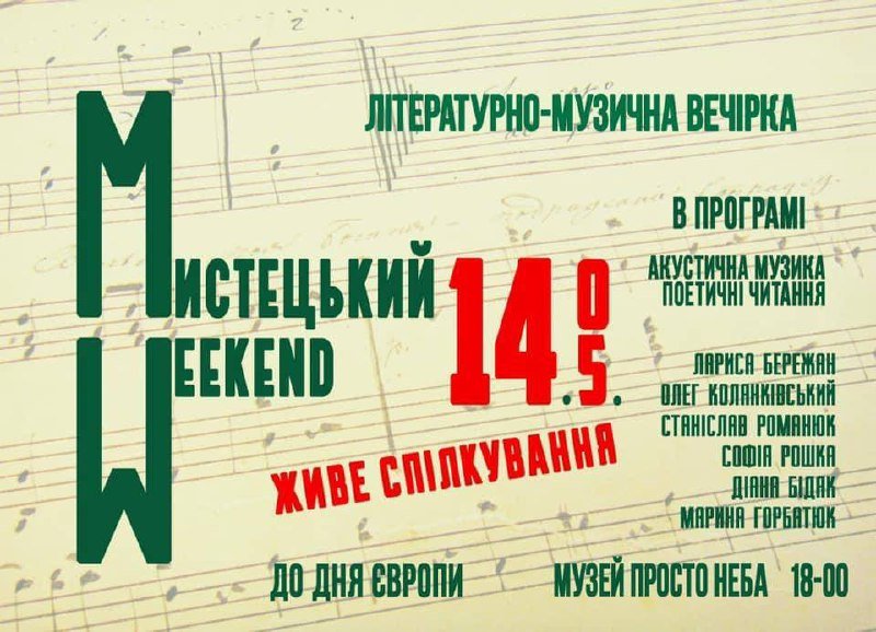 Поезія, музика та живе спілкування. Саме це чекає на відвідувачів літературно-музичної вечірки у п’ятницю, 14 травня, о 18:00. Проведуть її з нагоди Дня Європи у обласному музеї народної архітектури та побуту. В програмі дійства – акустична музика та поетичні читання.