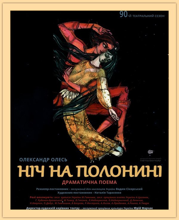 Під проводом ночі, один світ проникає в інший. Головні герої представники двох світів, знову і знову, потерпають від мук вибору “Бути чи не бути..” адже міфічних героїв та людських поєднує любовний трикутник. Автентичні народні пісні, дзвінка поезія О.Олеся й запальні танці – створюють неймовірну атмосферу в яку хочеться повертатися знову і знову.