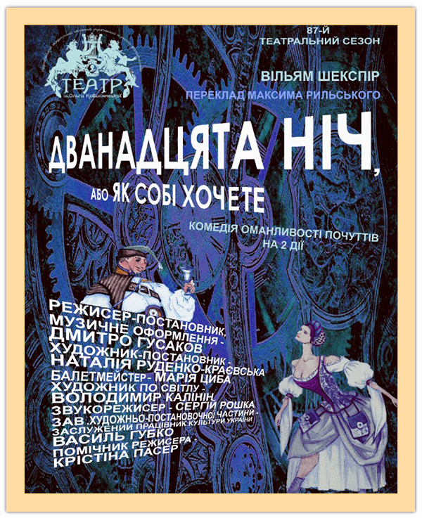 Ця остання життєрадісна комедія великого англійського драматурга епохи Відродження названа на честь дванадцятої ночі після Різдва, яка вважалася кінцем святкових днів і відзначалася особливо бурхливо. У цій комедії панує кохання, яке гартується випробуваннями. Долати їх було нелегко і 400 років тому, і сьогодні. А коли додаються ще й плутанина і непорозуміння, то смішно стає не акторам, а глядачам.