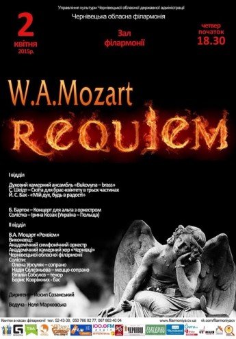 У програмі: В.А. Моцірт - Реквієм, С. Шейдт - сюїта для брас-квінтету, Й.С. Бах - Мій дух будь в радості, Б. Барток - концерт для альта з оркестром