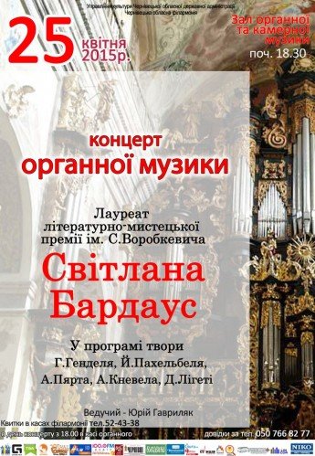 Чернівецька обласна філармонія запрошує чернівчан та гостей міста на концерт органної музики! Солістка – лауреат літературно-мистецької премії ім. С. Воробкевича Світлана Бардаус.