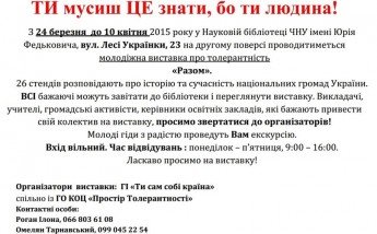 26 стендів розповідають про історію та сучасність національних громад України. Всі бажаючі можуть завітати до бібліотеки і переглянути виставку. Викладачі, учителі, громадські активісти, керівники освітніх закладів, які бажають привести свій колектив на виставку, просимо звертатись до організаторів!