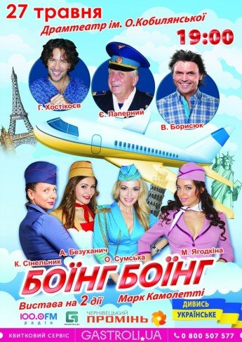 «Боїнг-боїнг» — легенда французького театру минулого століття. П'єса увійшла до книги рекордів Гіннесу, поставлена в 60 країнах світу. «Боїнг-боїнг» — комедія про роман молодого паризького ловеласа з трьома чарівними стюардесами. Обраниці літають на різних авіалініях, і це вимушує винахідливого жениха підстроювати своє життя під розклад «прильоту-відльоту» всіх «наречених». Виникаючі непорозуміння приводять до нескінченно смішних ситуацій.