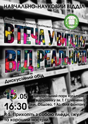 15 травня о 16:30 навчально-науковим відділом Студентського парламенту ЧНУ ім. Ю. Федьковича організовується дискусійний обід на тему «Феномен популярності підліткової фантастичної літератури. Втеча у вигадку від реальності..?».