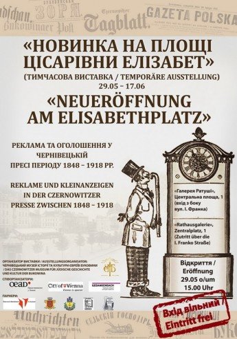 29 травня 2015 року о 15.00 у «Галереї Ратуші» (Центральна площа, 1) відбудеться відкриття тимчасової виставки «Новинка на площі цісарівни Елізабет». Реклама та оголошення у чернівецькій пресі періоду 1848 – 1918 рр.»