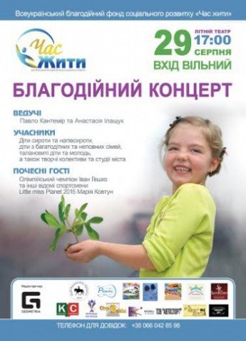 Всеукраїнський благодійний фонд соціального розвитку "Час жити" запрошує усіх небайдужих на благодійний концерт, який відбудеться 29 серпня о 17:00 у залі Літнього театру (вхід вільний).