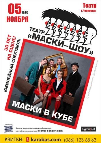 «Главная идея постановки в том, что мы все стремимся получить свободу, - говорит режиссер театра Георгий Делиев, но очень часто становимся рабами своих же стереотипов. «Маски в кубе» рушит все границы восприятия, каждый может увидеть здесь что-то свое и о себе, наша задача создавать такое, что в принципе невозможно объяснить словами». Спектакль "Маски в кубе" основан на новых номерах и режиссерских идеях, начиная от комедийных трюков и заканчивая декорациями на сцене. Однако, в шоу войдут и полюбившиеся зрителю пантомимы «Масок», такие как культовый "Вокальный дуэт Мана-мана-тынч-тынч-тытырым", который впервые появился на телевидении в 1985 году, "Танец умирающего лебедя" и "Танец самовара и чашек" из "Маски в опере". В спектакле принимают участие: Народный артист Украины Георгий Делиев, Народный артист Украины Борис Барский, Заслуженная артистка Украины Наталья Бузько, Александр Постоленко, Игорь Малахов, Михаил Волошин и др.