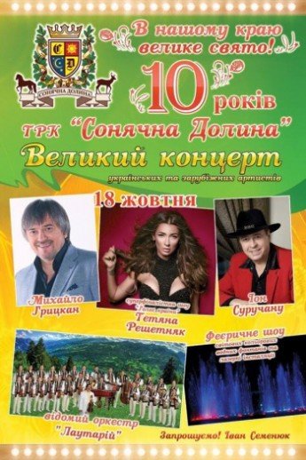 18 жовтня - особливий день для ТРК «Сонячна Долина» , тому що ми святкуємо 10-річчя від дня заснування найбільшого заміського комплексу на Буковинні !!!