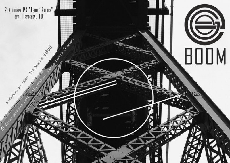 З вечора вівторка і до недільного ранку ловимо нестримні хвилини, наповнені музикою, флюідами і невловимими компонентами ейфорії, які залишають смак закоханості та відчуття того, що ранок дарує ностальгічне очікування наступного вечора на проекті EgoBoom (2й поверх Egoist Palace). Bхід вільний
