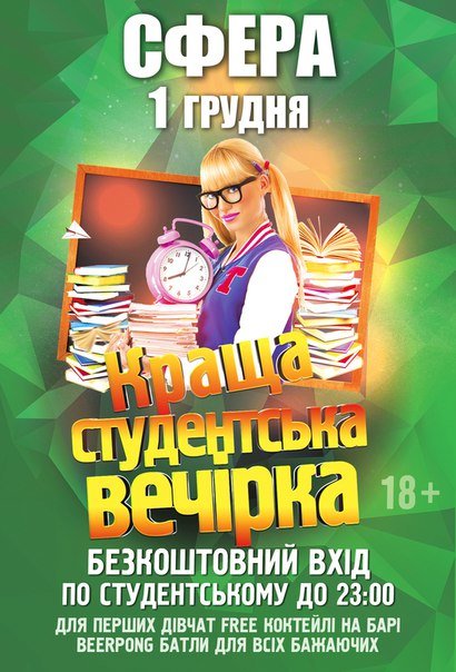 НАЙКРАЩА студентська вечірка міста в нічному клубі Сфера чекає на всіх Вас, охочих весело та круто відірватись! Приєднуйтесь до нас, адже найкраща атмосфера драйвового відпочинку лише в Сфері! Шару на сесії отримуєте в нагрузку до прокачаного настрою! Безкоштовні #BEERPONG батли для всіх охочих з 22:00 до 23:30!