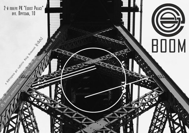 З вечора вівторка і до недільного ранку ловимо нестримні хвилини, наповнені музикою, флюідами і невловимими компонентами ейфорії, які залишають смак закоханості та відчуття того, що ранок дарує ностальгічне очікування наступного вечора на проекті EgoBoom (2-й поверх)