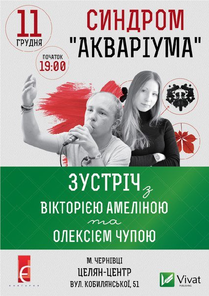 11 грудня, 19:00 – зустріч з письменниками та презентація романів «Акваріум» Олексія Чупи та «Синдром листопаду, або HomoCompatiens» Вікторії Амеліної , що вийшли у серії сучасної української інтелектуальної прози «Вітражі» харківського видавництва «Віват».