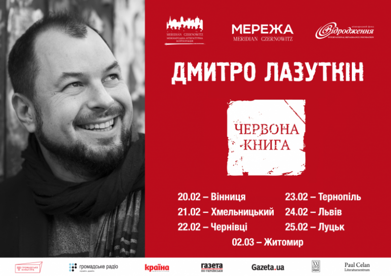 20 лютого розпочнеться друга частина туру на підтримку збірки віршів поета і журналіста Дмитра Лазуткіна «Червона книга». Нагадаємо, що наприкінці минулого року автор із презентаціями та дискусіями відвідав центр і схід України. Заходи відбуваються у рамках проекту «Мережа», організатором якого є Міжнародна літературна корпорація MERIDIAN CZERNOWITZ. Проект реалізується за підтримки Міжнародного Фонду «Відродження».