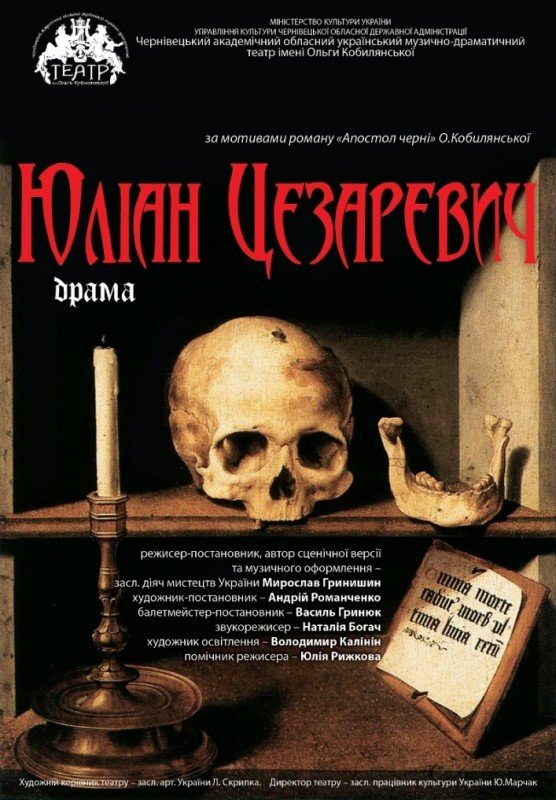 Роман «Апостол черні» – останній великий твір Ольги Кобилянської, у радянські часи був заборонений як націоналістичний і не видавався. Його проблематика, тема апостольського служіння рідному народові, українська національна ідея – все це відлякувало тодішніх укладачів видань творів письменниці. Сьогодні Чернівецький академічний музично-драматичний театр імені Ольги Кобилянської вдруге звертається до цього унікального інтелектуального твору і прагне з театральної сцени говорити про як ніколи актуальні нині проблеми.