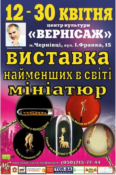 З дванадцятого по тридцяте квітня у Чернівцях триватиме виставка мікромініатюр, виконана відомим майстром Володимиром Казарянином.