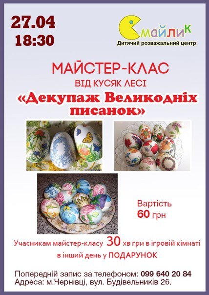 27 КВІТНЯ о 18:30 - Майстер-клас «Декупаж Великодніх писанок» від Кусяк Лесі.