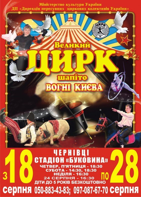 Гостинно запрошуємо вас з 18 по 28 серпня на площу стадіону "БУКОВИНА", де вiдбудуться прем’єрнi вистави Єдиного в Українi Великого Державного Цирку-Шапiто “ВОГНI КИЄВА”!