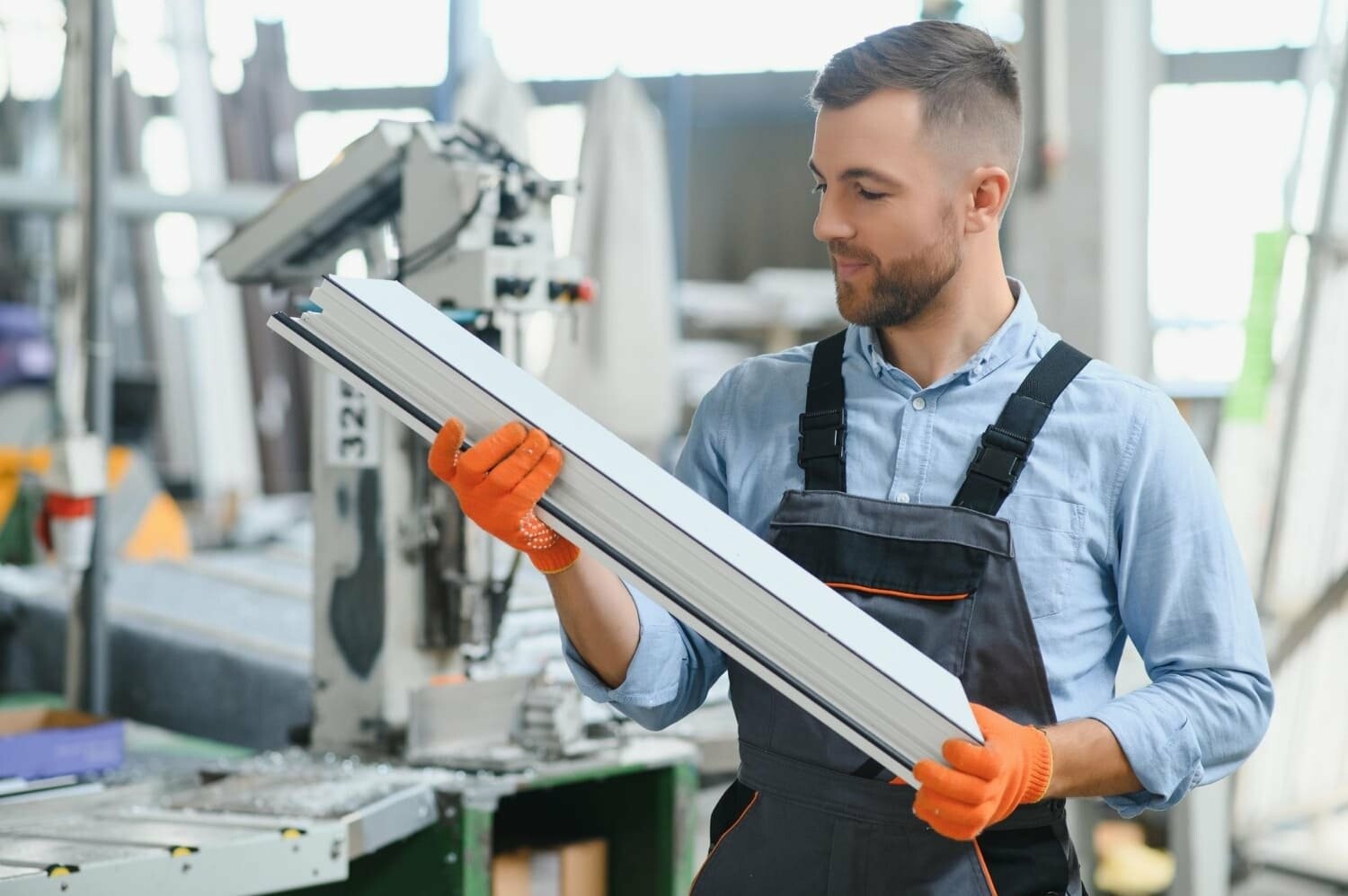 - Резка профиля. На этом этапе требуется надёжная пила для точного раскроя. Чем выше объём производства, тем важнее скорость и стабильность углов.