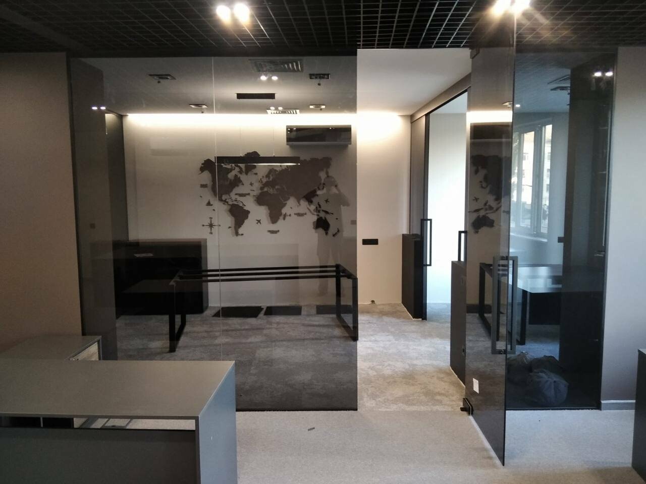 - Перегородки с матовым или тонированным стеклом: Создают уединение, сохраняя светопропускание.