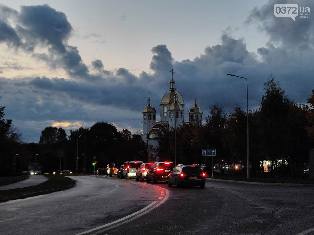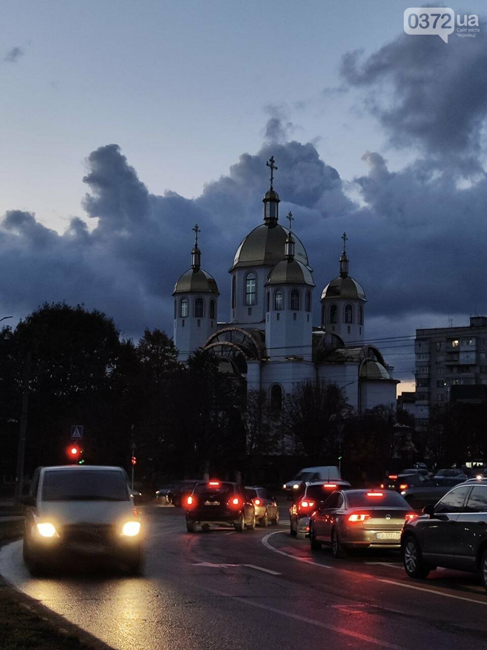 На фото — вечірні Чернівці у всій красі: тиха алея біля парку, дорога з авто в променях фар і величний храм на тлі сутінків. Місто живе своїм розміреним життям, зберігаючи магію осені в кожному кадрі.