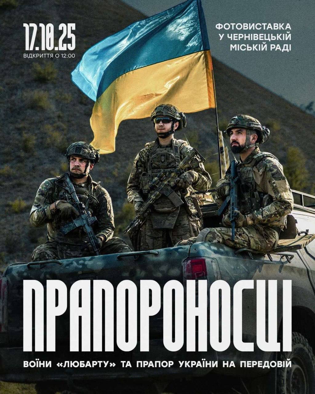 У пʼятницю, 17 жовтня, о 12:00 у приміщенні Чернівецької міської ради відкриють фотовиставку про українських воїнів та Державний прапор на фронті. Про це повідомила ГО «Любарт Фаундейшн». Про це повідомляють у міській раді.