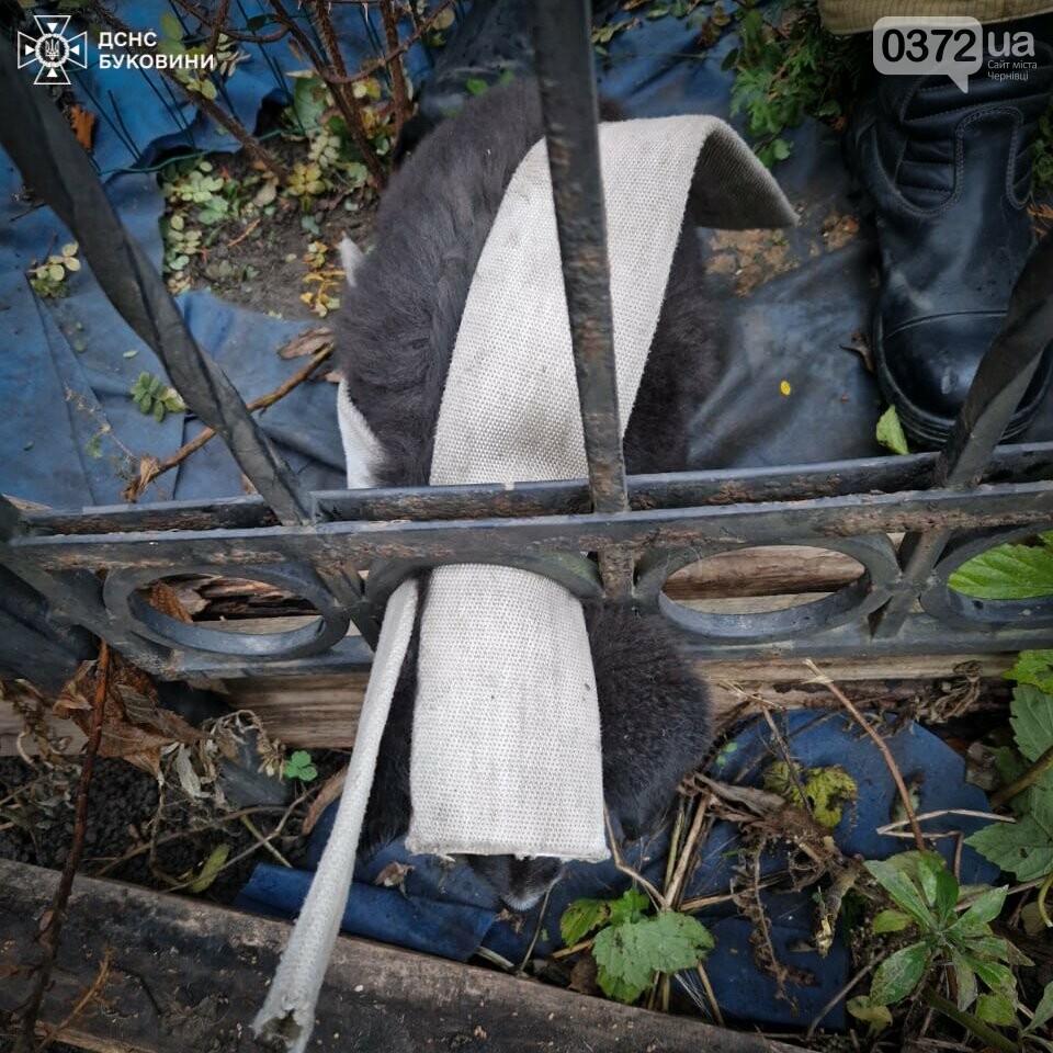 Ранком 7 листопада на лінію екстреної допомоги 101 надійшов дзвінок від місцевих жителів. Люди почули жалібні звуки та виявили маленьке цуценя, яке потрапило у пастку між елементами металевого паркану. Про це повідомляють у ГУ ДСНС у Чернівецькій області.