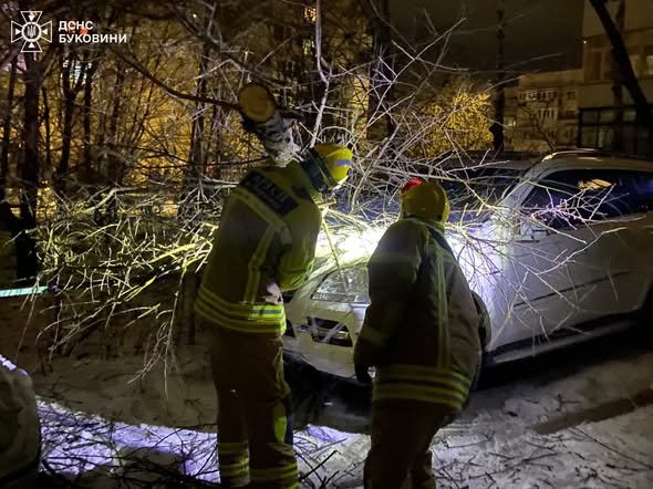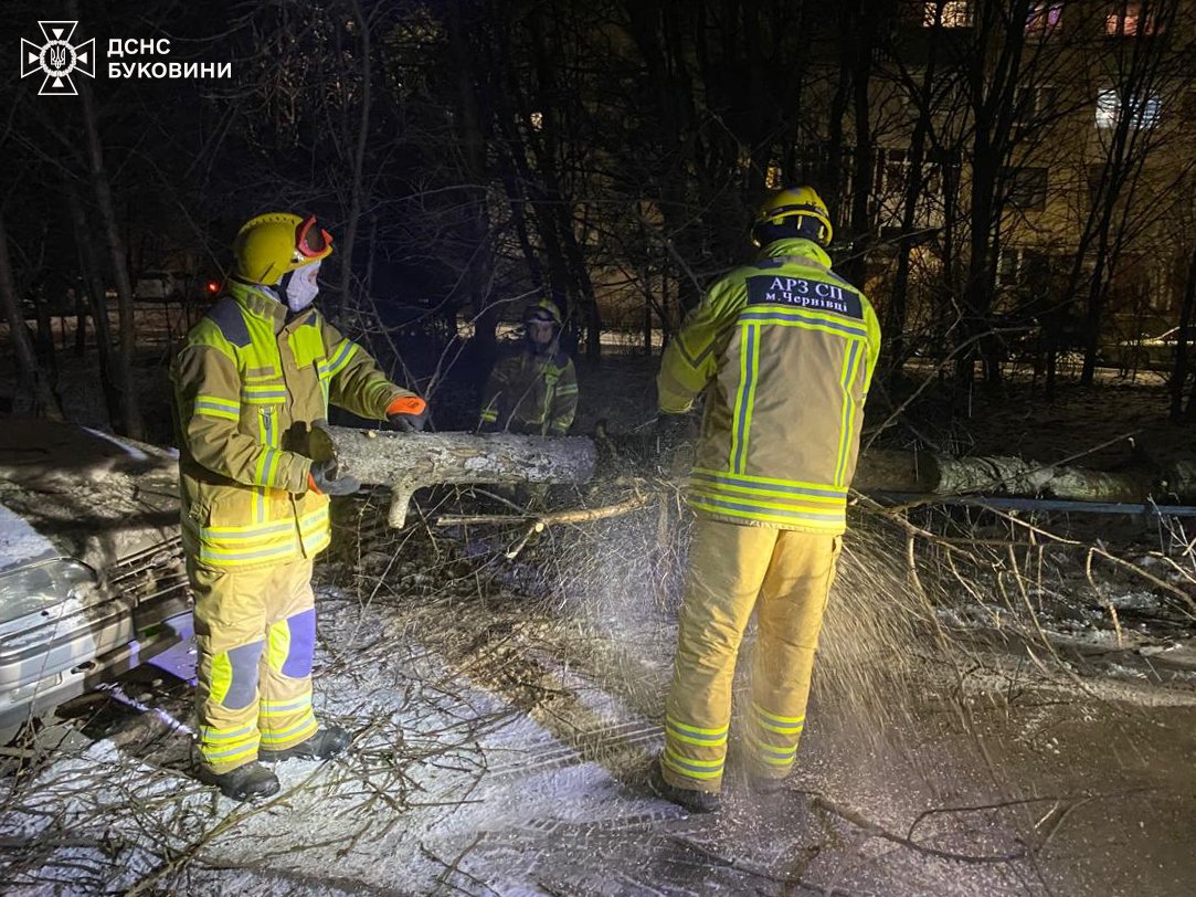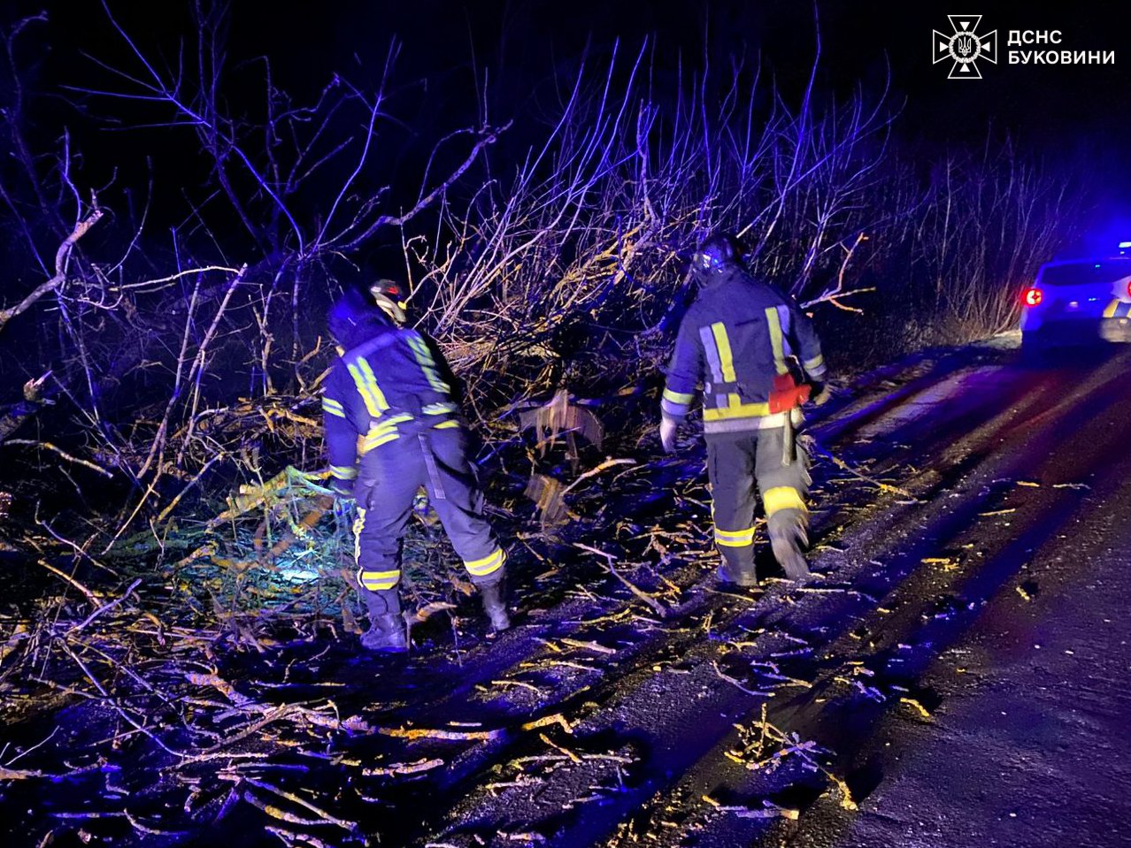 У Чернівцях дерево впало на припаркований Mercedes. У селі Дубівці Мамаївської територіальної громади рятувальники прибрали дерева та гілля, що завалили дорогу та частково заблокували проїзд транспорту.