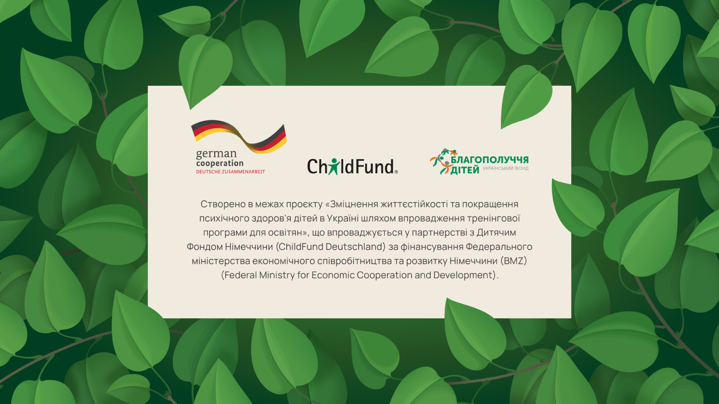 "Методика «Цілющий ліс» впроваджується в межах проєкту «Зміцнення життєстійкості та покращення психічного здоров'я дітей в Україні шляхом впровадження тренінгової програми для освітян», який реалізує Український фонд «Благополуччя дітей» у партнерстві з Дитячим Фондом Німеччини за фінансування Федерального міністерства економічного співробітництва та розвитку Німеччини."