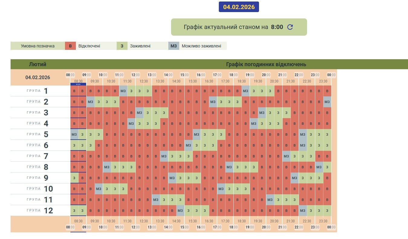 Згідно з оновленим графіком погодинних відключень на 4 лютого, станом на 8:00 ранку у Чернівцях зафіксували відключення електроенергії у всіх груп споживачів, повідомляє АТ "Чернівціобленерго".