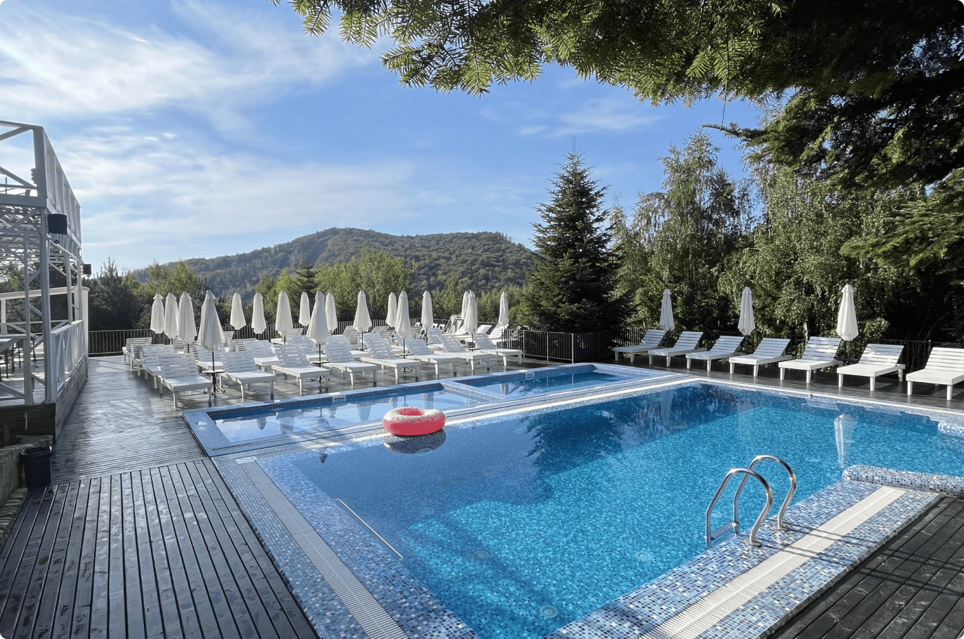 Окремий акцент зроблений на басейн у Мигово, який працює незалежно від сезону. Це важливо для тих, хто приїжджає не лише влітку, а й у холодний період, коли доступ до води залишається актуальним елементом відпочинку. Передбачені окремі зони для дорослих і дітей, що дозволяє комфортно відпочивати різним категоріям гостей. Вода в дорослому басейні підтримується на рівні 28–30°C, поруч розташований дитячий басейн із такою ж температурою, а також окрема зона для найменших гостей із більш теплою водою. Такий формат особливо доречний після активного дня, коли потрібно поєднати відновлення і перебування на свіжому повітрі.