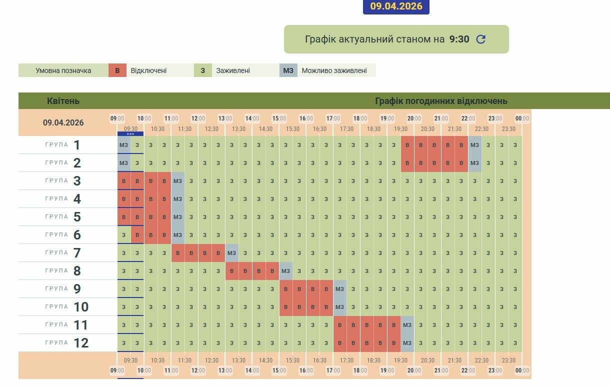 Графік діє за групами споживачів — мешканців просять перевіряти свою чергу та слідкувати за оновленнями, адже розклад може змінюватися протягом дня.