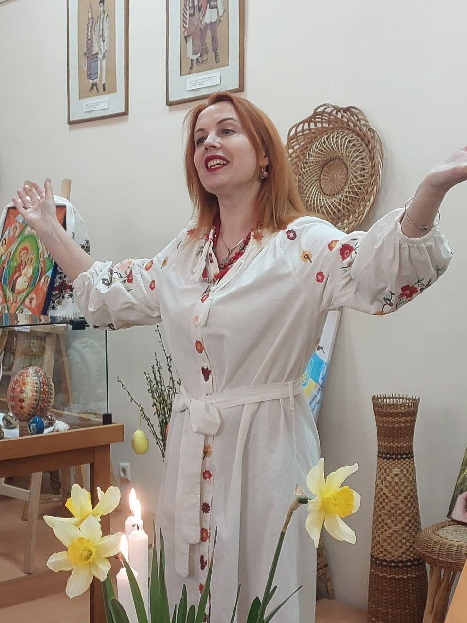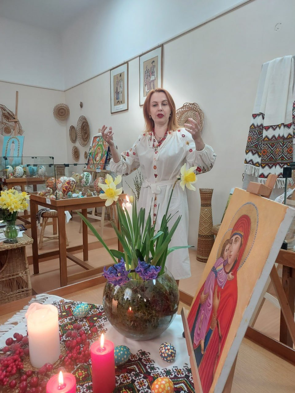 Мисткиня розписує яйця курей, качок, перепелів і страусів. Виставлені роботи охоплюють кілька тематичних напрямків: трипільські орнаменти, давні космологічні символи та елементи християнської традиції. Виставку доповнюють ікони, рушники та живопис.
