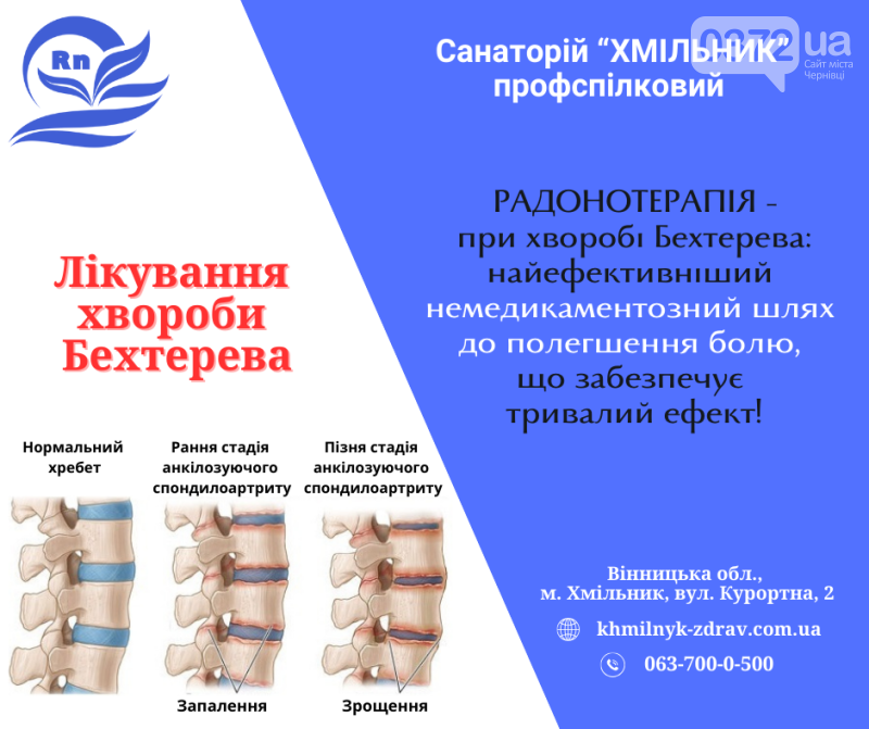 Лікування хвороби Бехтерева у Хмільнику — це ефективна санаторно-курортна реабілітація при анкілозивному спондилоартриті з використанням унікальних природних ресурсів та сучасних методик.